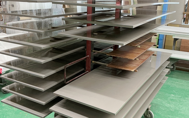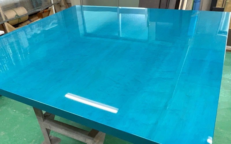 色はもちろん、艶の程度や鏡面のクオリティなどお客様のご要望に応じて個別に製作いたします。本番でのイメージの差異をなくすため、実際に使用する材料をご支給いただきサンプルを製作します。本番同様の作業工程で製作しますので、材料到着後から完成までに約2週間前後お時間を頂戴しています。費用はご要望のサンプルの仕様によって変動しますが、木目出しの鏡面仕上げの場合で10,000円程度が目安となります。別途調色料が必要な場合もありますので、詳しくはお問い合わせください。